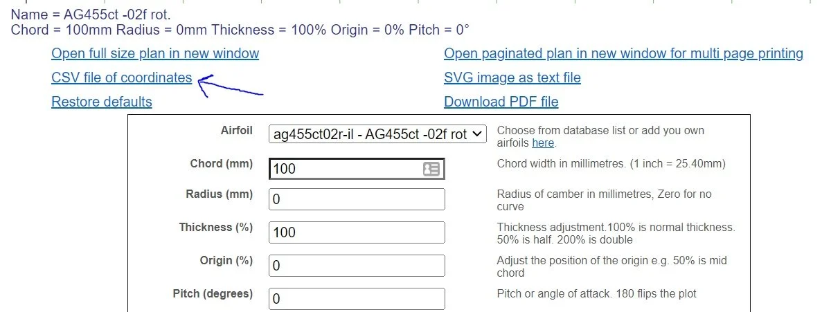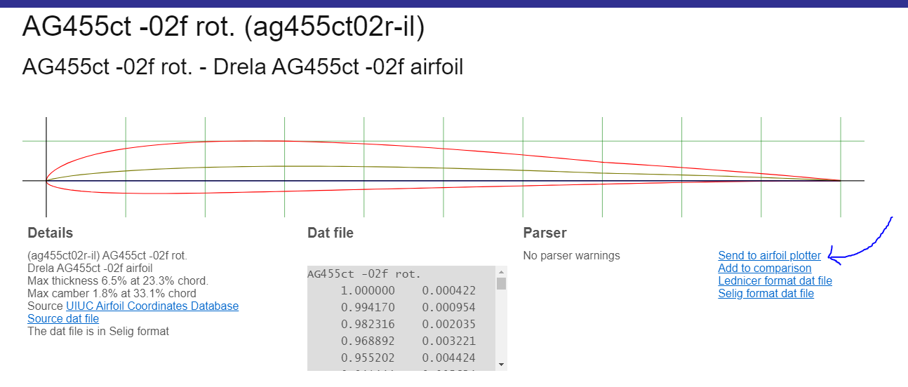 I’m going model that AG455ct first. A quick search on http://airfoiltools.com/ brings us to a page with all the information about the airfoil we will need.