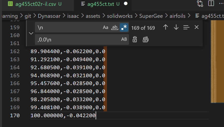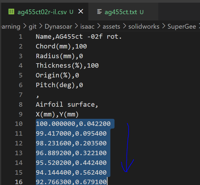 Open the CSV file in a text editor. We will be copying all the data for the airfoil surface to a separate text file.